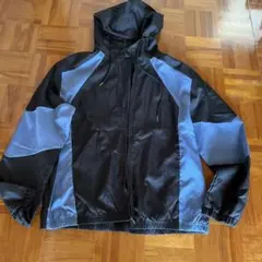 フード付きの青と黒のナイロンジャケット、Lサイズ、ジッパーポケット付き。