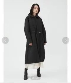 キルティングデザインのブラックロングコート、フリース内張りで暖かさを提供。