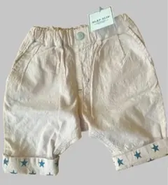 ベージュのギンガムチェックデザイン、スカラップエッジのショートパンツ。