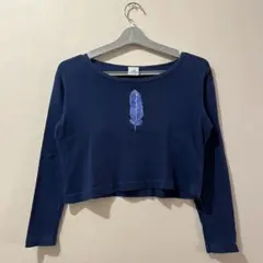 鮮やかなオレンジと青のパターンが特徴の長袖トップス、軽やかな素材で快適な着心地。
