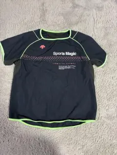 通気性のある素材を使用した、前面にプリントが施されたブラックのSサイズシャツ。