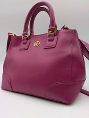 ピンクベージュのレザー製で、Tory Burchのロゴプレートが特徴的なショルダーバッグ。