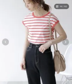 ストライプの装飾が施されたグレーの半袖Tシャツ、綿100%で快適な着心地。