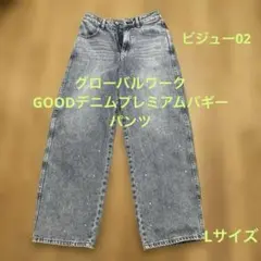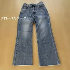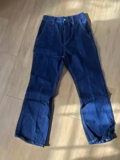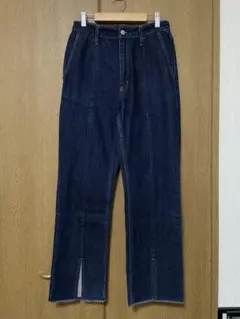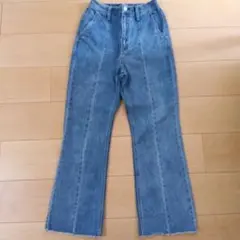 ライトブルーのデニムブーツカットパンツ、切りっぱなしのフリンジ裾でトレンド感を演出。