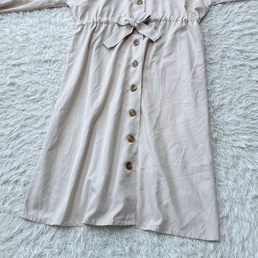 ベージュのシャツワンピース、フロントボタンアップデザイン、長袖、ウエストリボン付き。