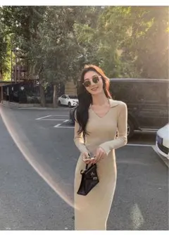 春のお出かけにぴったり!セクシーで高見えする大人可愛いニットドレスワンピース。タイトなシルエットとロング丈が、女子会やデートでも印象を引き立てます。普段着にも上品さをプラス!