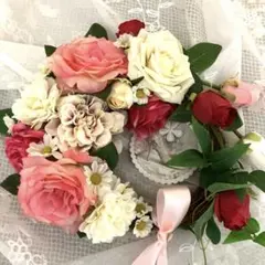 主な素材: クレイフラワー(薔薇・小花)、ドライフラワー(かすみ草)
