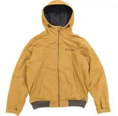 チェック柄のブラウンジャケット、フード付きでアウトドアに最適。