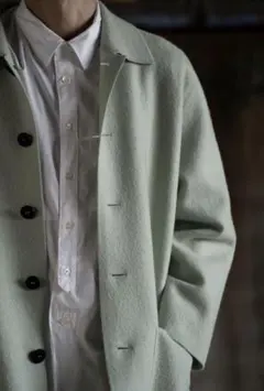 また、身幅がたっぷりしているのに肩周りがすっきりとした理想的なコートのシルエットを実現しています。一枚袖と共に太めに設定されたアームホールによって、コートの中に沢山の衣類を着込むことも可能です。
