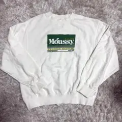 ターコイズカラーのMOUSSYのグラフィックスウェット、コットン100%で快適な着心地。