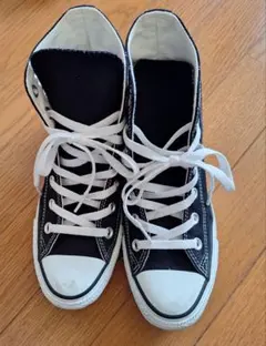 ベージュのキャンバス素材で作られたコンバースのオールスター、ハイカットデザイン。