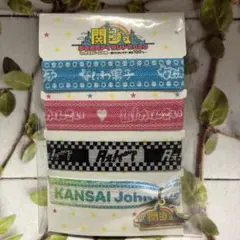 赤・白・青のストライプデザインのサテンシュシュ、金色のチャーム付き。