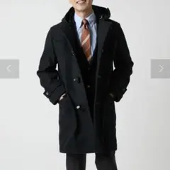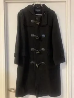 ネイビーのフード付きダッフルコート、タータンチェックの裏地が特徴です。