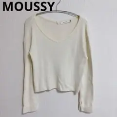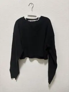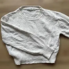 フワフワのアイボリー色ニット、ボリュームスリーブでクロップド丈。