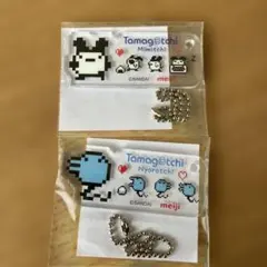 バンダイのたまごっちデザインのイエローとブルーのキーホルダー。