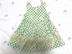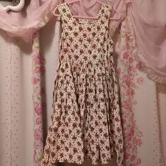黄緑の生地にバラの総柄、袖、スカートにはたっぷりとフリルがとっても可愛いワンピースです。ボリューミーなスカートに腰にはリボンとシルエットもとても綺麗です。