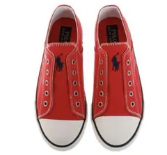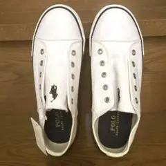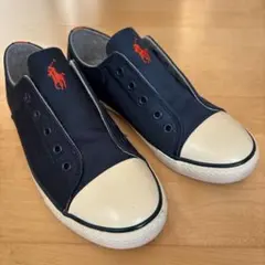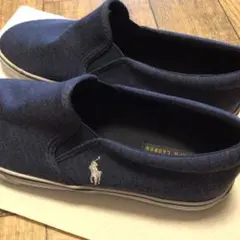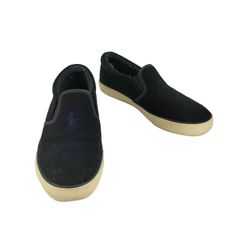ブラックのスリッポン、刺繍ロゴ付きでカジュアルに最適。