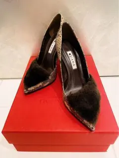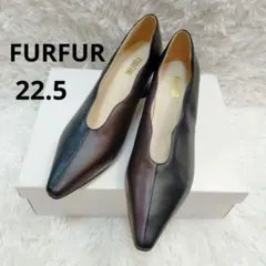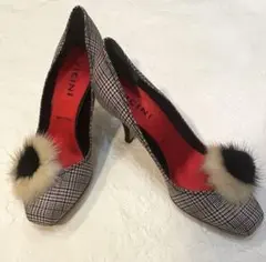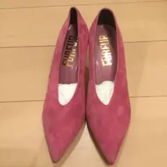ブラウンのスエード素材にファー付きのフラットパンプス。