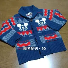 ミッキーマウス刺繍のネイビーのカーディガン、赤と白のストライプが特徴。