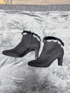 スエード素材のブラックショートブーツ、ジッパー付きでスタイリッシュ。