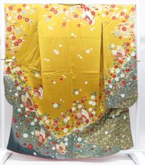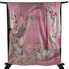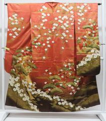 超美品 絹 袷 広襟 振袖 現代 振袖 成人式 着物 赤 桜 159裄65