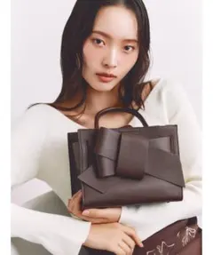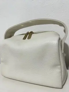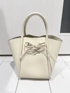 大きなバックルが特徴のホワイトとベージュのトートバッグ。
