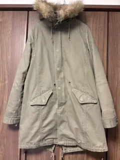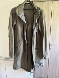 フード付きのオリーブ色モッズコート、キルティングライニングで保温性抜群。