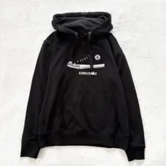 フード付きのレッドパーカー、CONVERSEのプリントロゴ付き。