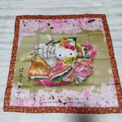 ハローキティの花とチェリーの刺繍が施されたカラフルなタオルハンカチです。