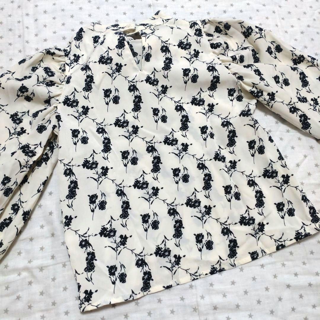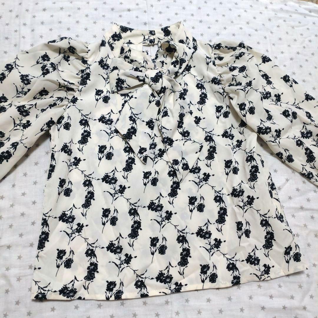アイボリーとブラックの花柄、リボン付きパフスリーブブラウス。