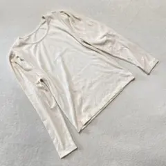 リブ素材のアイボリー長袖Tシャツ、フリルネックデザインが特徴。