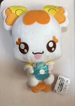 オレンジ色の妖怪ウォッチフードを被ったキャラクターぬいぐるみ、笑顔のデザインで小型、しっぽ付き。