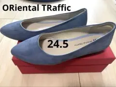 スエード素材のピンクポインテッドトゥパンプス、メタリックストライプが特徴。