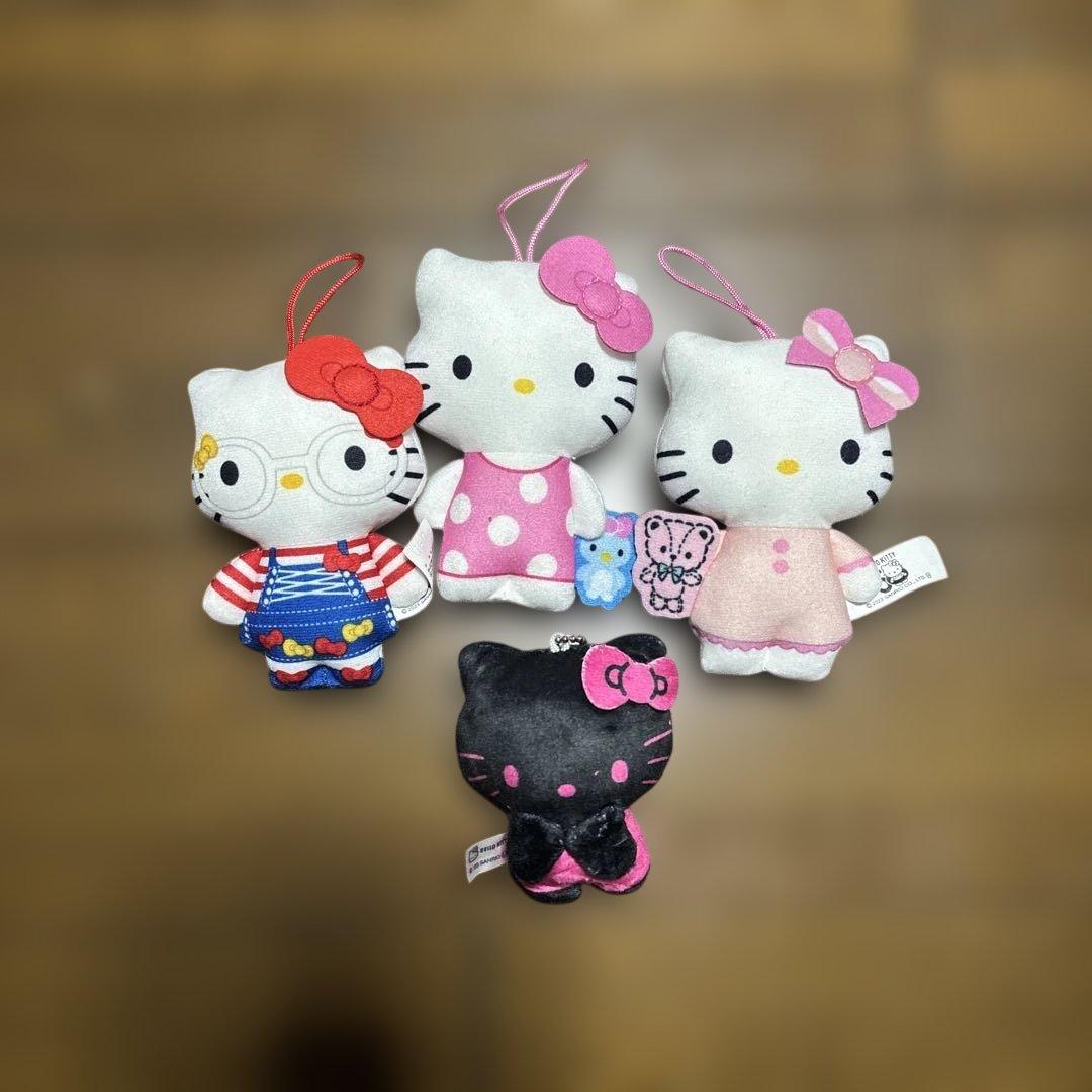 さまざまな衣装を着たハローキティのぬいぐるみ4体セット。