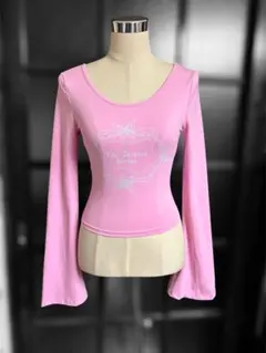 リボン付きピンクリブ編み長袖トップス
