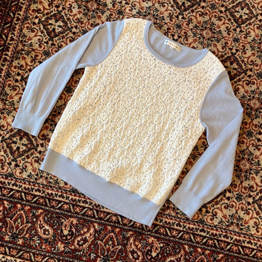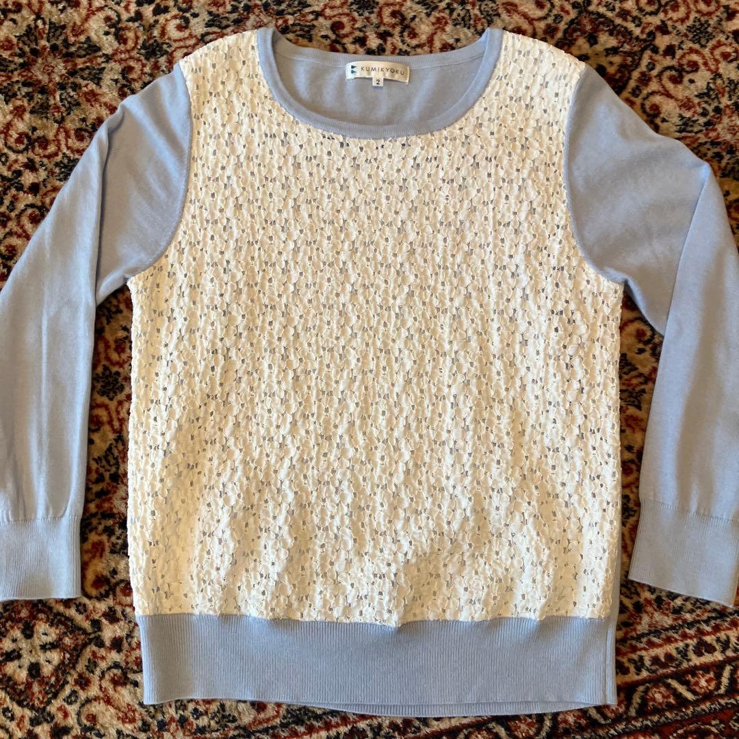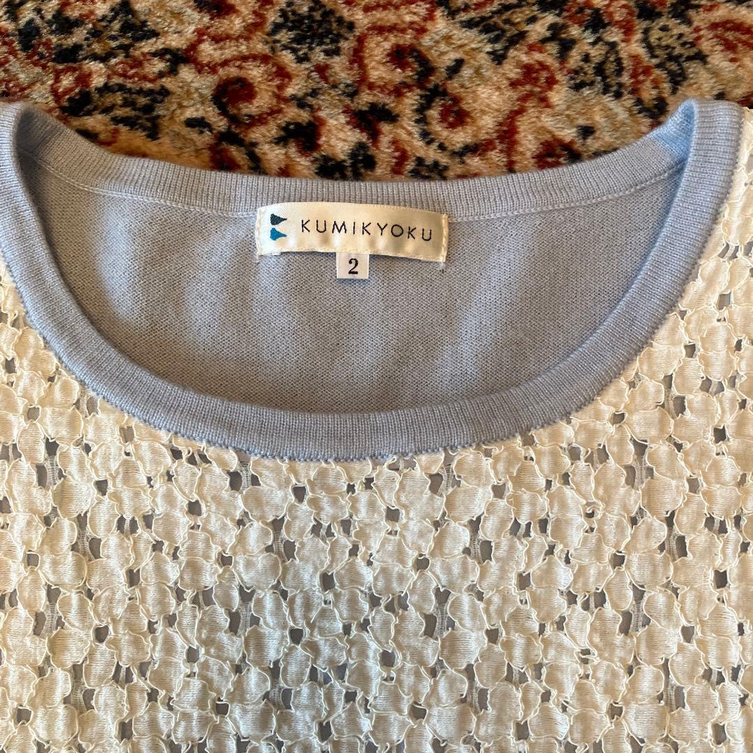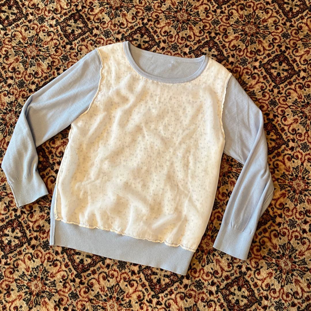 薄い水色とオフホワイトが特徴の上品なデザインです。春、秋、冬と長い期間ご着用いただけます。前側のみ裏地があります。(画像3枚目)
