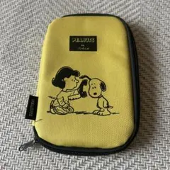 スヌーピーのイラストが施されたベージュとブラウンの合成皮革製小型ポーチ。