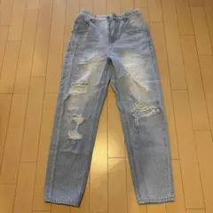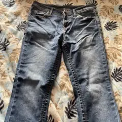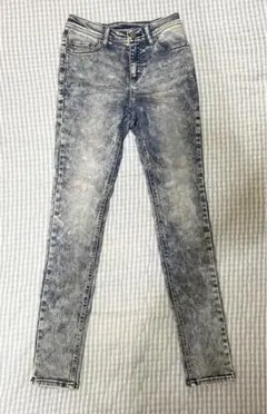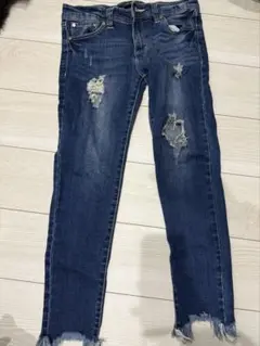ダークブルーのスキニーデニム、フロントポケット付きでスタイリッシュ。