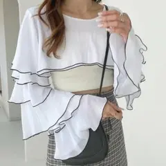 Heather シースルー素材のブラックとホワイトのストライプのフリル付きブラウス。