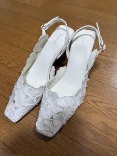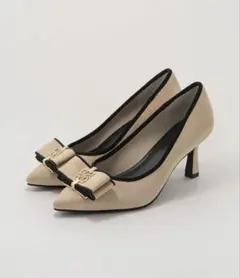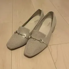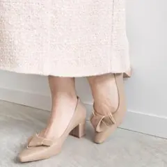 ライトブルーのポインテッドトゥデザインで、低ヒールの快適なパンプス。