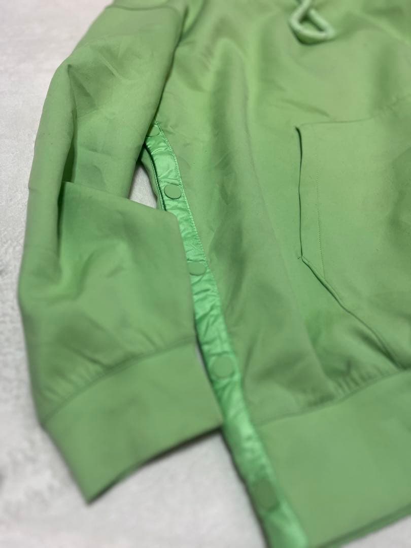 調整可能なドローコード付きのライトグリーンフードパーカー。