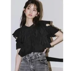 オフショルダーの黒いブラウスで、刺繍のディテールが特徴的です。