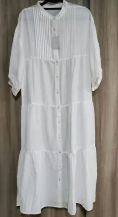 ホワイト・ブラックのストライプデザインのボタン付き長袖シャツワンピース。