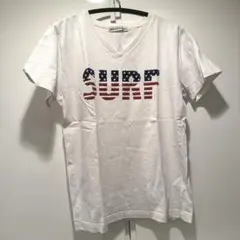 ホワイトのVネックTシャツ、アメリカ国旗のポケットデザイン付き。