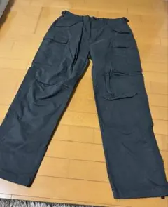 ダークグレーのカーゴパンツ、4つのポケット付きで実用的。ストレート ウール100%のカーゴは希少です