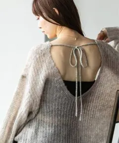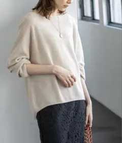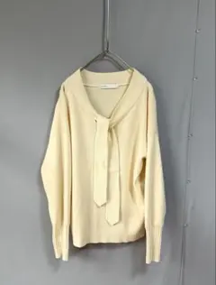 アイボリーのVネックケーブル編みセーター、ネイビーとゴールドのストライプが特徴。
