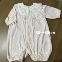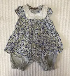 ブラウン・ホワイトのチェック柄、肩ひも付きロンパース、サイズS。