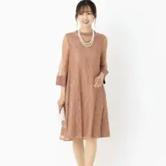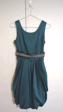 ダークグリーンのレース素材のタイトドレス、ラウンドネックでノースリーブのデザイン。