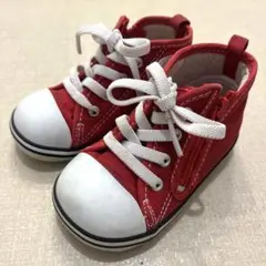 CONVERSEのベビーシューズ、13.5cmです。サイドにジッパーが付いているため、脱ぎ履きがしやすいデザインです。つま先部分に多少の汚れと、靴底に若干の使用感が見られますが、まだまだ履いていただける状態です。