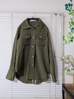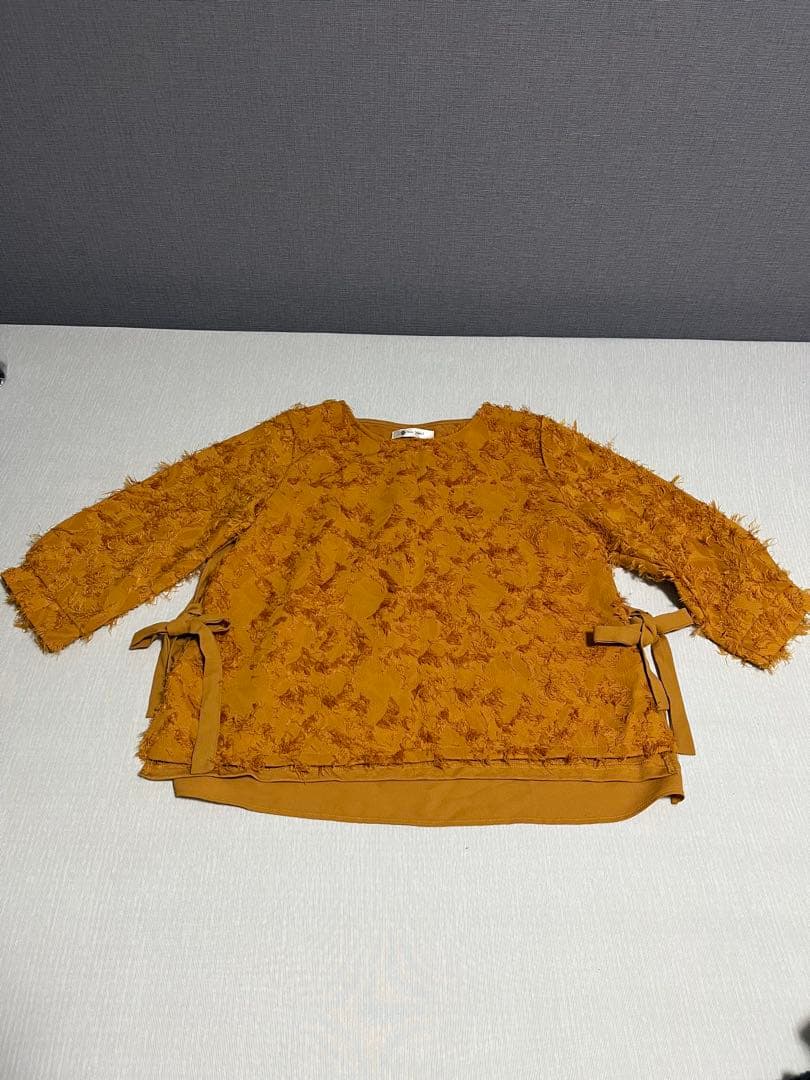 フリルとリボンが特徴のマスタード色の長袖トップス。